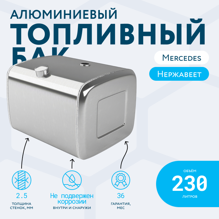 Алюминиевый бак не подвержен коррозии, что делает его более долговечным, а так же сбережет вашу топливную систему. Бак из алюминия в два раза легче стального бака, хотя он и изготовлен из листа увеличенной толщины в 2,5 мм. В конструкции предусмотрены цельные перегородки, которые проварены по периметру. Баки из алюминия так же оснащены заливной горловиной с самозапираемым непроливаемым клапаном (который становится барьером для разлива топлива, а так же становится защитой от попадания мусора в бак при открытой крышке) . Кроме того, однозначно что алюминиевый бак выглядит намного привлекательнее и дороже - где бак в том числе становиться и элементом тюнинга автомобиля. На алюминиеввые баки действует увеличенная гарантия - 36 месяцев.