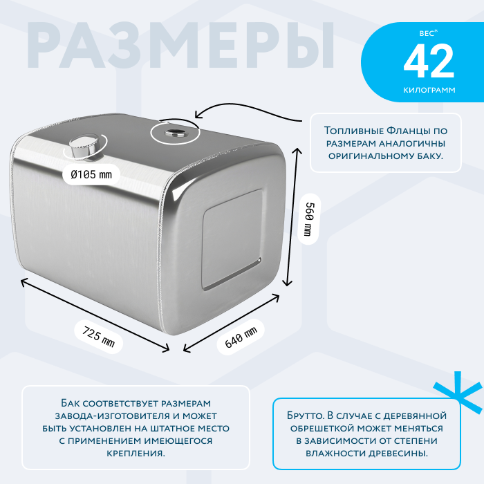 - Так же, если вы приобретаете алюминиевый топливный бак, он будет в деревянной обрешетке (для усиления защиты при транспортировке). При просчете веса и объема, цена за доставку может измениться по факту взвешивания на самом терминале транспортной компании. Так как деревянная обрешетка соответственно изготовлена из древесины, и она имеет свойство значительно набирать вес в зависимости от влажности окружающей среды.